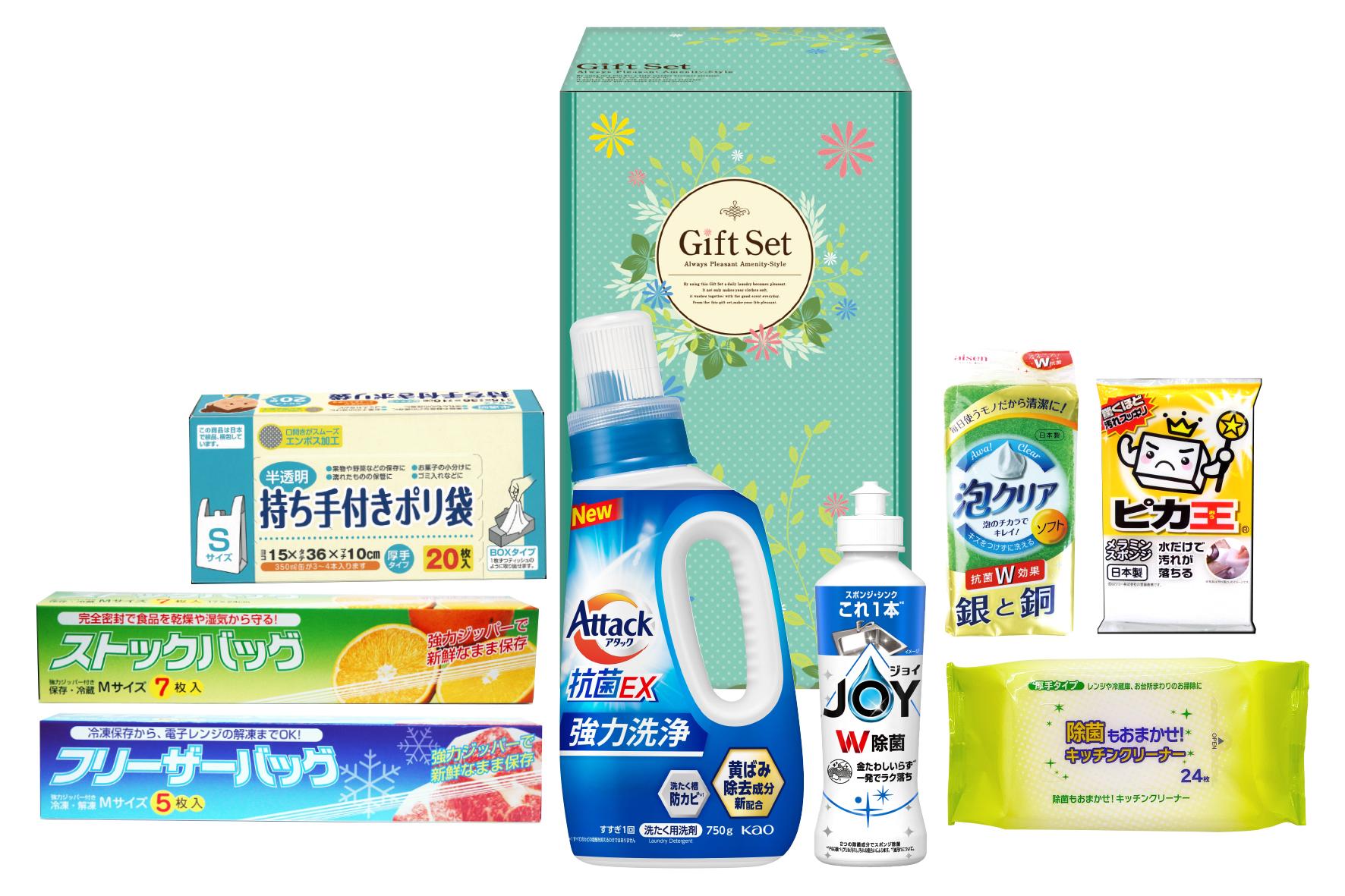 | 商品内容 | ●花王アタック抗菌EX750g×1 ●P&G 除菌ジョイコンパクト170ml×1 ●持ち手付きポリ袋S20 枚×1 ●除菌キッチンクリーナー24 枚×1 ●ストックバッグM7枚×1 ●フリーザーバッグM5枚×1 ●泡クリアスポンジ×1 ●ピカ王ミニ×1 |