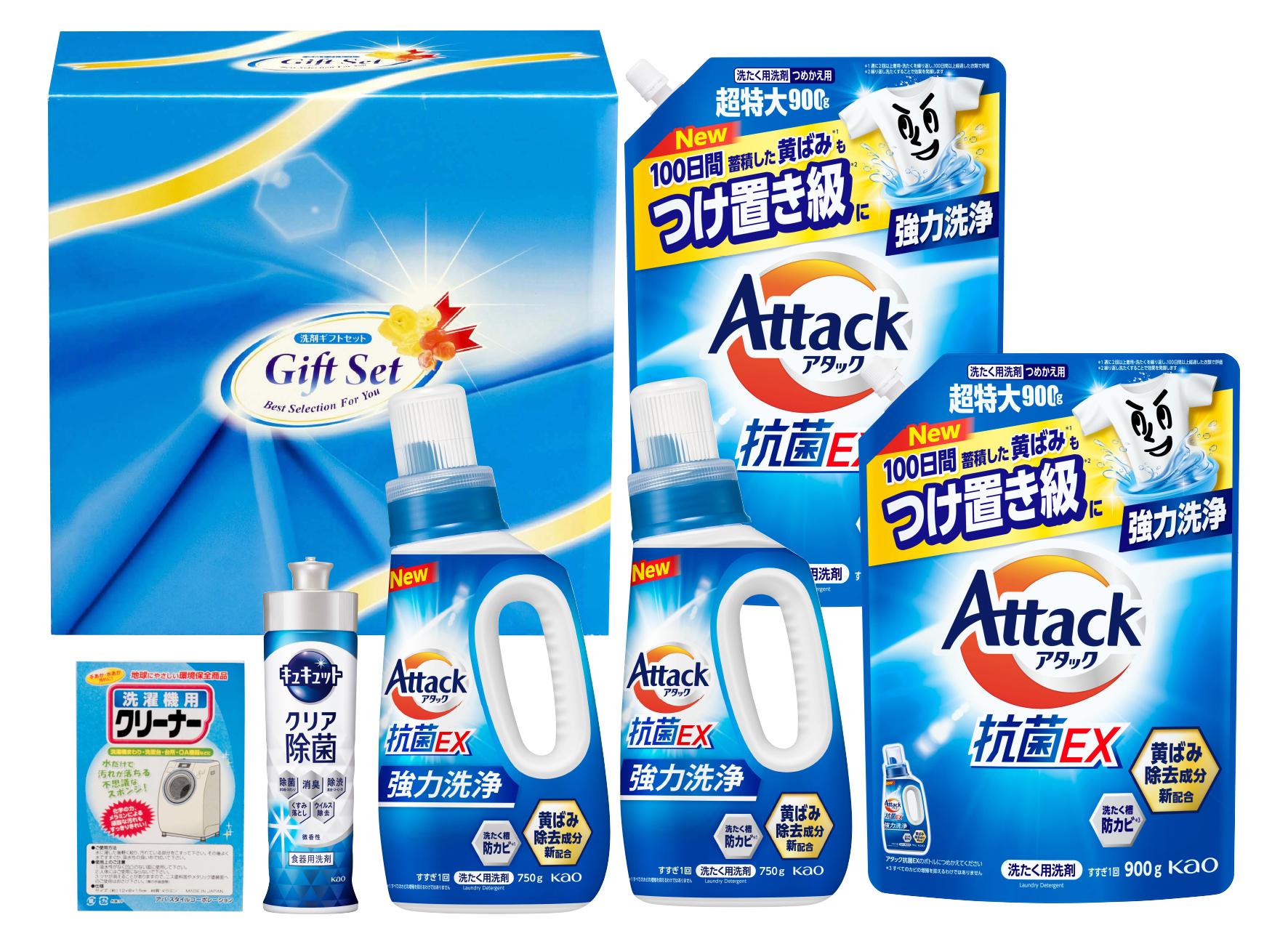 | 商品内容 | ●花王アタック抗菌EX750g×2 ●花王アタック抗菌EX詰替特大900g×2 ●花王キュキュットクリア除菌220ml×1 ●洗濯機用クリーナーM×1 |