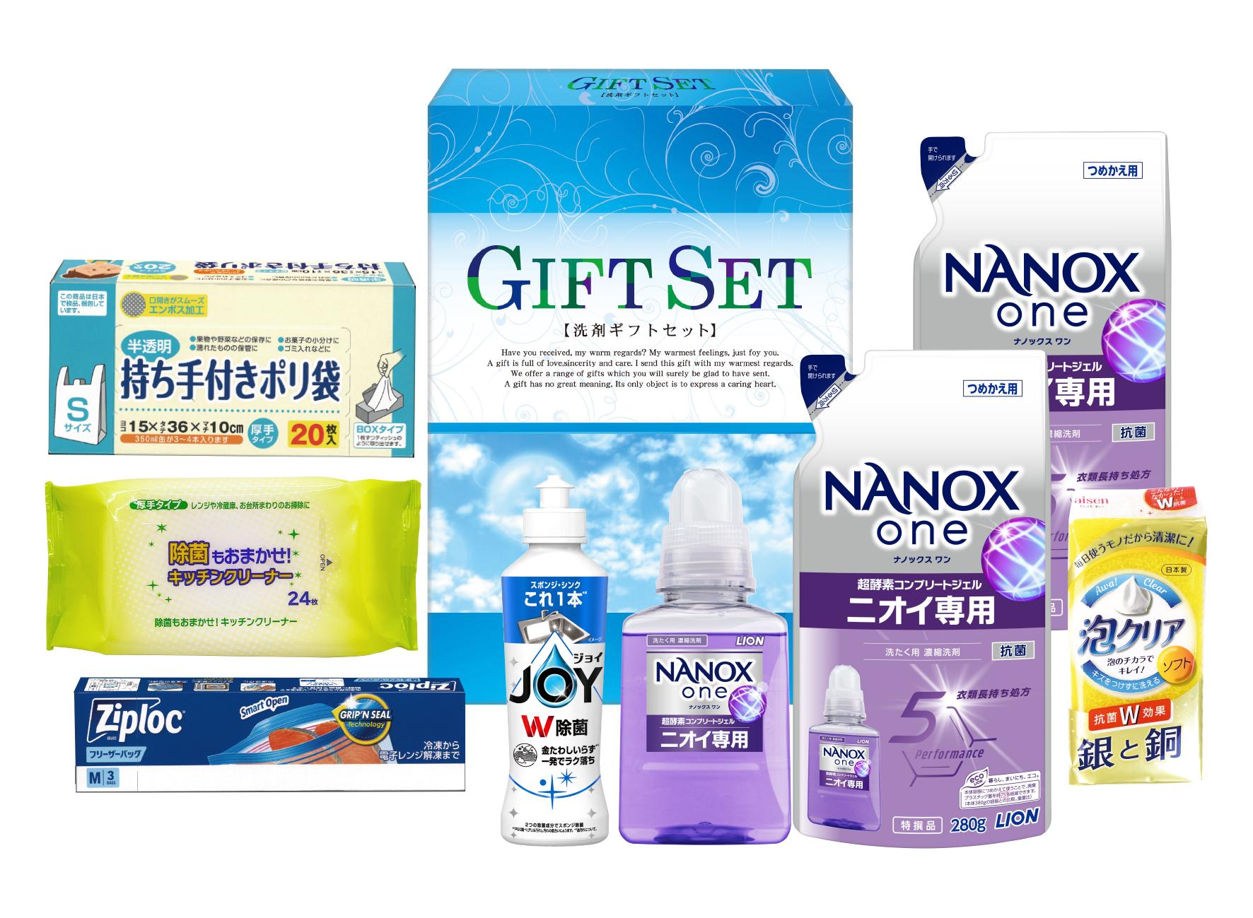 | 商品内容 | ●ライオンナノックスone380g×1 ●ライオンナノックスone 詰替280g×2 ●P&G 除菌ジョイコンパクト170ml×1 ●ジップロックフリーザーバッグM3枚《 タイ製》×1 ●持ち手付きポリ袋S20 枚×1 ●除菌キッチンクリーナー24 枚×1 ●泡クリアスポンジ×1 |