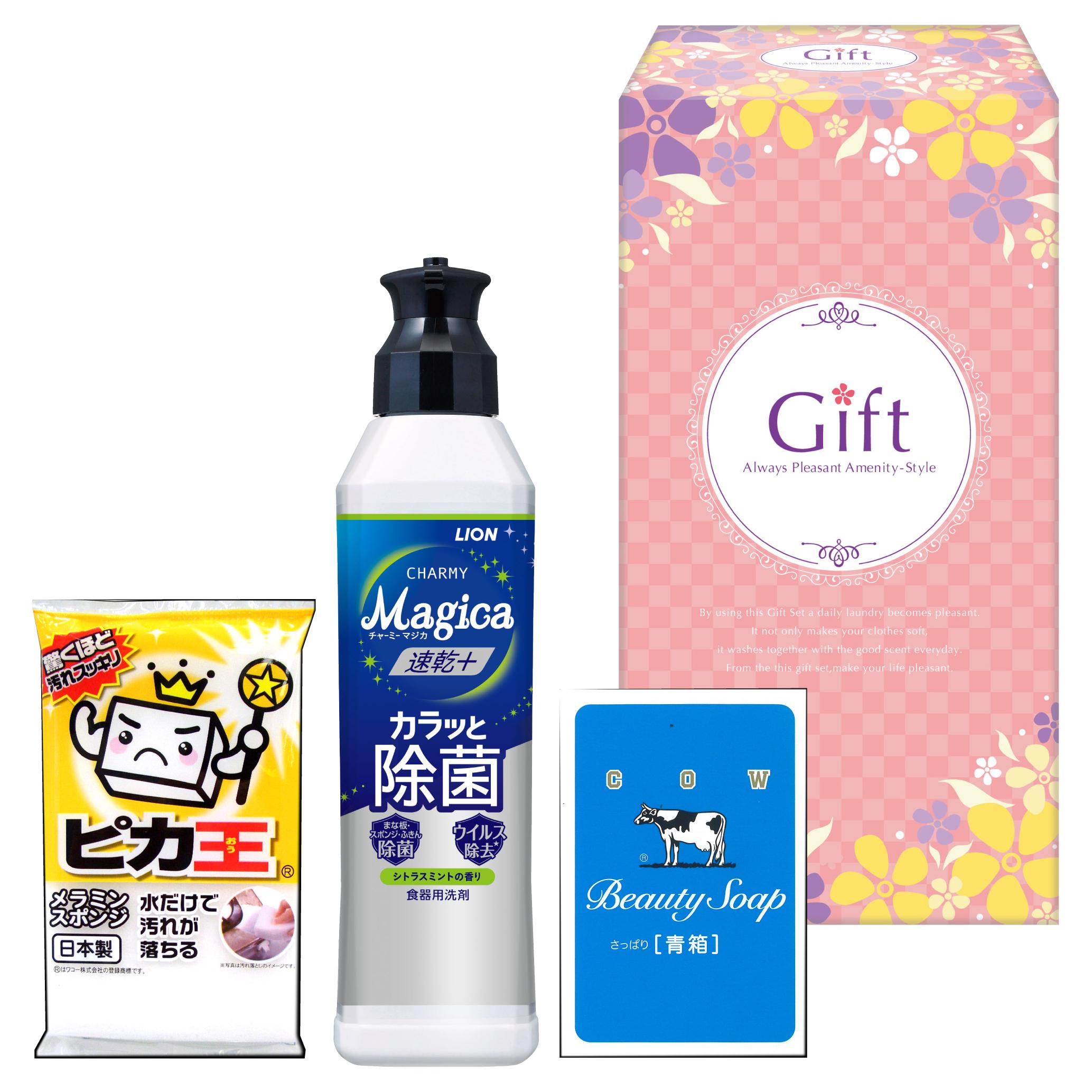 | 商品内容 | ●ライオンチャーミーマジカ速乾プラス220ml×1 ●ピカ王ミニ×1 ●牛乳石鹸青箱×1 |